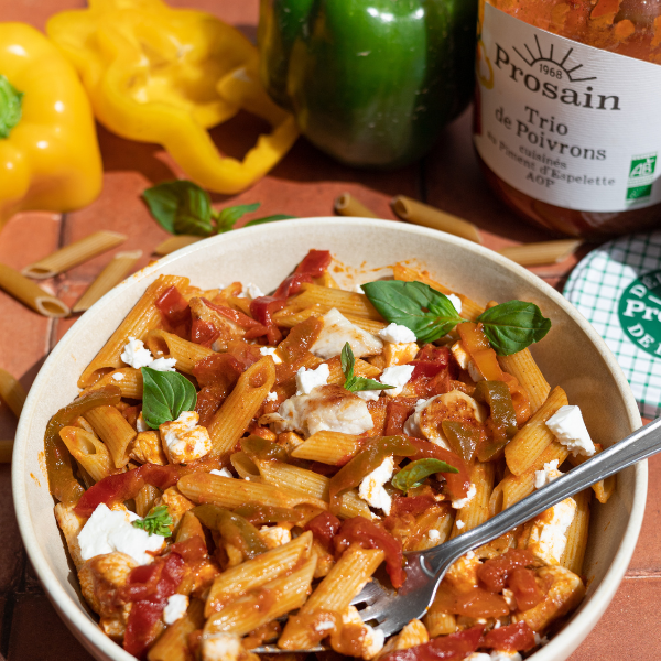 Nos poivrons rouges, verts et jaunes sont cultivés en Espagne et sont sélectionnés dans des exploitations maraîchères respectueuses du cahier des charges de l’agriculture biologique. Nous excluons toujours la zone d’Almeria pour nos approvisionnements en Espagne. Cette recette est assaisonnée avec un piment d’Espelette AOP (Appellation d’Origine Protégée), originaire du Pays basque.
