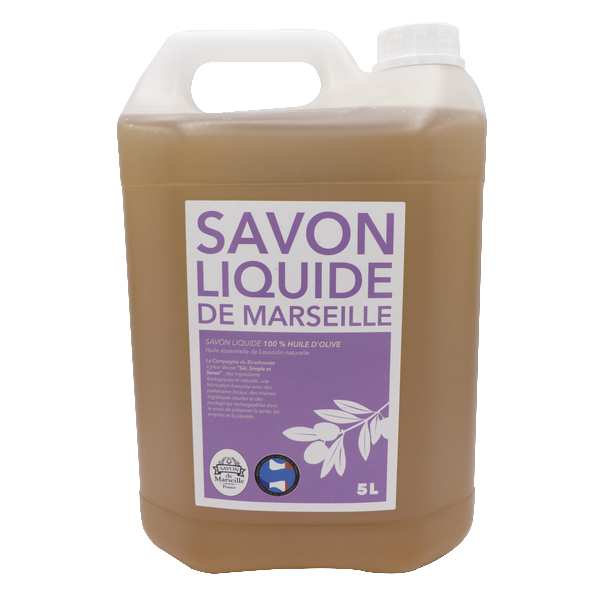 Savon liquide de Marseille à l’huile d’olive parfumé à l’huile essentielle de lavandin naturelle en bidon de 5l.