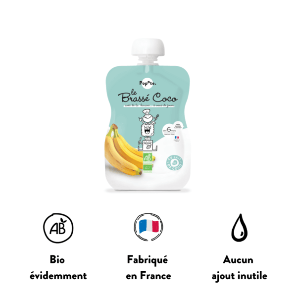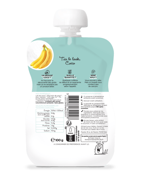 Lait de coco* 37% (noix de coco*, eau), banane* 34%, eau, riz* 7%, jus de citron concentré*.