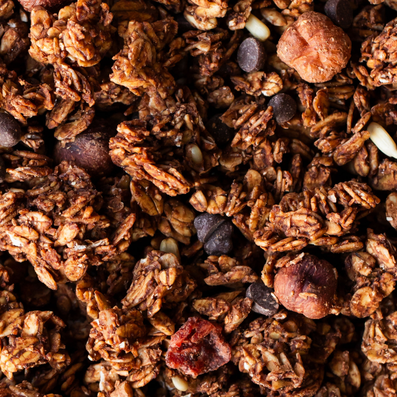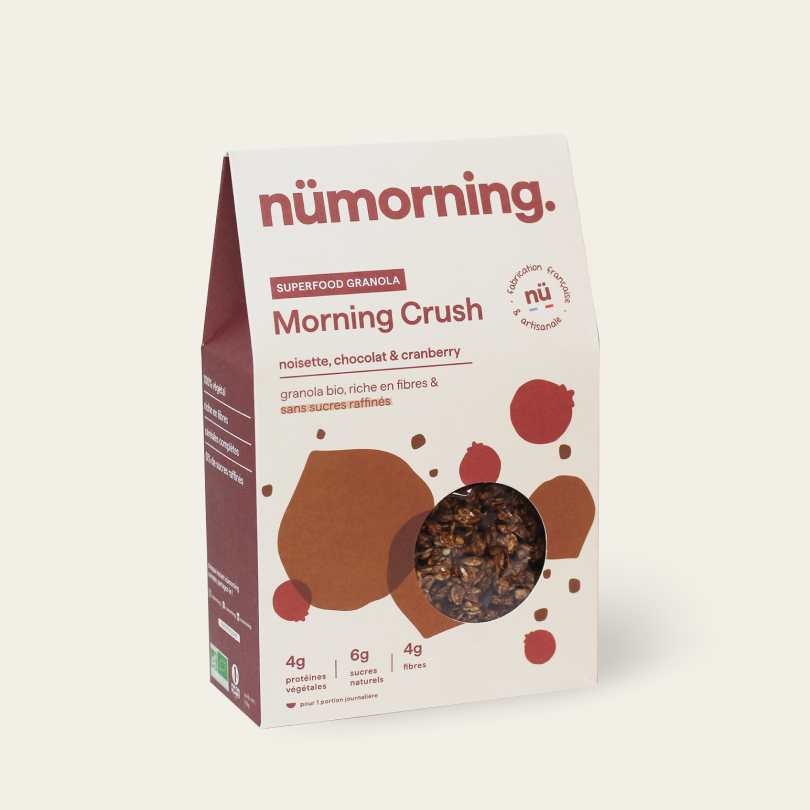 Cette recette de granola Morning Crush par nüMorning est un subtil mariage entre le croquant des noisettes, l'amertume du cacao, la douceur des pépites de chocolat et l’acidité discrète des cranberries. Une fois gouté, difficile de s'arrêter !