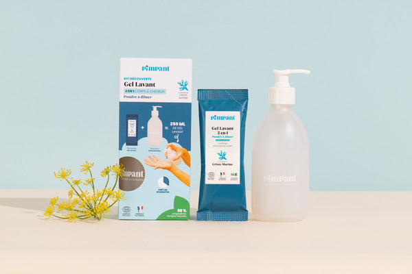 Ce kit contient 1 bouteille 300ml + 1 recharge de gel douche en poudre à diluer.