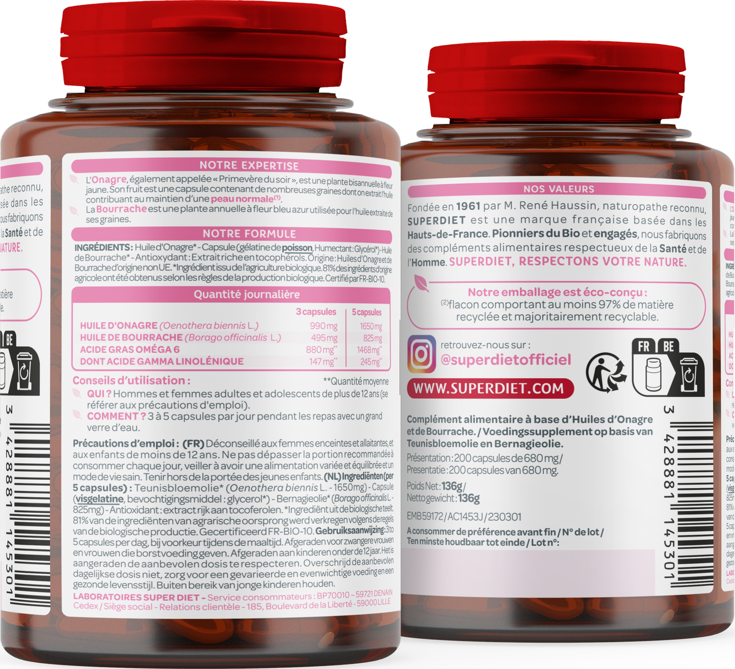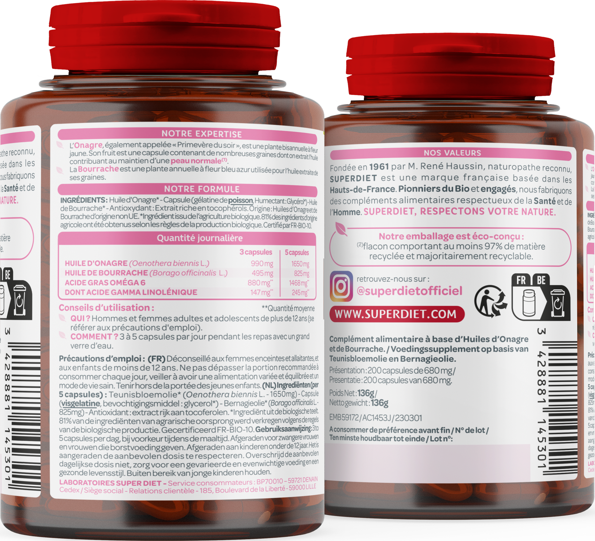 Quantité moyenne pour 3 capsules, Huile d'Onagre (Oenothera biennis L.) 990 mg, Huile de Bourrache (Borago officinalis L.) 495 mg, Acide gras Oméga 6 880 mg, dont Acide Gamma linolénique 147 mg.